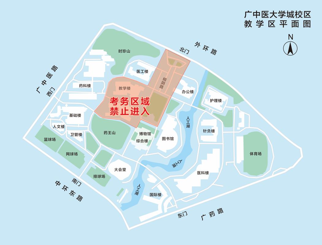四、考务工作人员及其他教工车辆,可从广药路广中医东门(国际楼)、南门(中环天桥)凭工作证件进出,部分区域需绕行,请查看平面图。