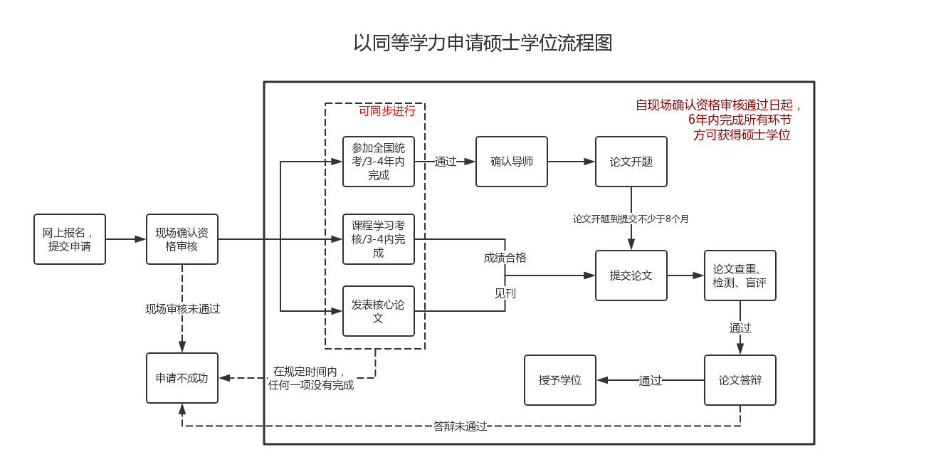 B. 申请人自资格审查通过之日(现场确认资格审核)起,原则上三年内(特殊原因最长不超过四年)完成所申请专业的课程学习考核(课程包括学位课、必修课、选修课,并通过“同等学力人员申请硕士学位外国语水平全国统一考试”和“学科综合水平全国统一考试),且成绩合格。四年内未通过课程学习考核和国家组织的水平考试者,本次申请无效。将在同等学力平台上进行信息清退处理。