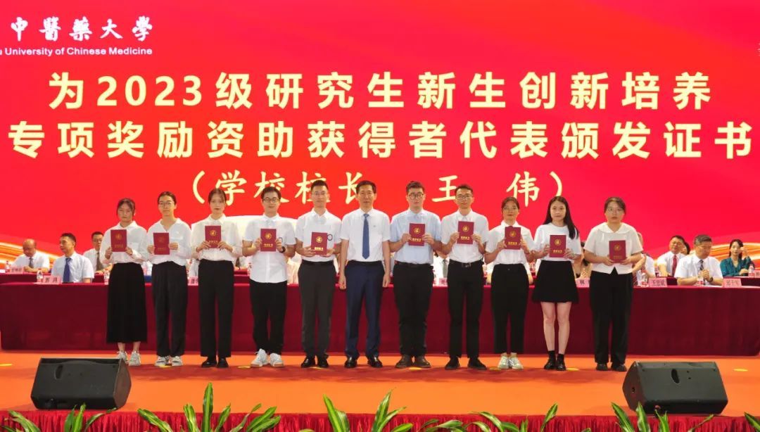 典礼上,学校为2023级研究生新生创新培养专项奖励资助获得者进行表彰,校长王伟向获奖代表颁发证书。校长王伟作了题为《把握阴阳之道,笃志博学,开启人生新篇章》的开学致辞,勉励同学们将青春奋斗汇入新时代,融入中国梦,融入中医药传承创新发展中,努力为中医药事业添砖加瓦。博士生导师邱士军教授作为教师代表发言,他寄语同学们要敢于探索人生的多彩之光,用信念明灯探寻光的方向,用扎实本领助燃激情,以十足的真诚追随光的脚步,拓宽视野在广阔天地竞逐光的绚烂,以饱满热情的姿态迎接新挑战,开启精彩人生。2017级中医学八年制张开源(中医专硕)代表在校学生发言,与新生分享了关于大学期间如何成为时间的主人、找到适合自己的最优解、成就自我三个问题的思考与心得。2023级博士研究生张璐代表研究生新生发言,立志在“胸怀祖国、服务人民”的使命担当中去追逐实现梦想,做一名人民的好医生、中医药的好传人、新时代的好青年、广中医的好儿女。