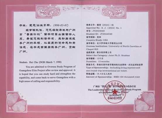 1 | 楚惠 | 第一临床医学院 | 邱士军 | 联合培养 博士研究生 | 美国 | 北卡罗来纳大学教堂山分校 | 12 |