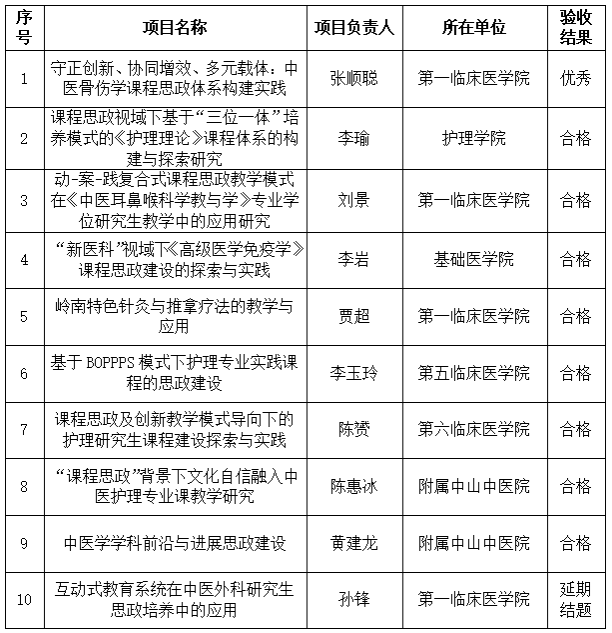 优秀及合格等级优先推荐申报下一年广东省研究生教育创新计划项目,延期结题项目将参与下一年度研究生课程思政建设项目结题验收。