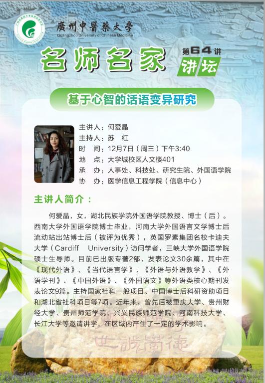 通讯地址:广东省广州市番禺区大学城外环东路232号广州中医药大学办公楼 邮编:510006