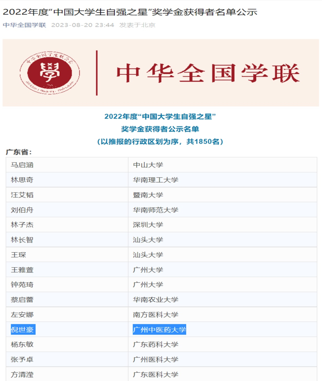 近日,由共青团中央、全国学联指导,中国青年报社、新东方教育科技集团、中国青年创业就业基金会联合举办的2022年度“中国大学生自强之星”奖学金评选活动结果揭晓。我校博士研究生倪世豪(第一临床医学院,中医内科学,导师杨忠奇)在层层激烈竞争中脱颖而出,荣获2022年度“中国大学生自强之星”荣誉称号。活动以“踔厉奋发 勇毅前行”为主题,旨在树立当代大学生中热爱祖国、品行优良、不畏艰难、自强不息的榜样。全国共有1850名大学生获得2022年度“中国大学生自强之星”奖学金,其中广东省大学生92名。