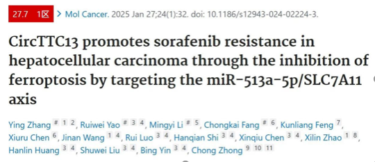 近日,我校第一临床医学院2021级中西医结合临床专业博士研究生章颖(导师:钟崇)在国际权威期刊《Molecular Cancer》发表了题为《CircTTC13 promotes sorafenib resistance in hepatocellular carcinoma through the inhibition of ferroptosis by targeting the miR-513a-5p/SLC7A11 axis》的学术论文。《Molecular Cancer》是Springer Nature旗下收录的国际顶级杂志,致力于从分子的角度促进癌症和相关生物医学科学领域的研究,隶属中科院一区Top期刊,最新影响因子为27.7。